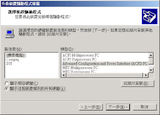 - 點選下一步,點選下面的【顯示這個裝置類別的所有硬體】,然後選擇 ACPI 的 driver。